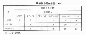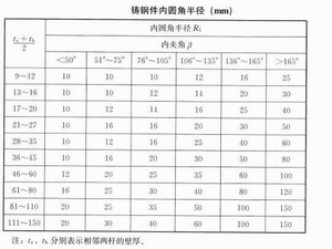 4、最小壁厚、內外圓角半徑需要根據鑄鋼件輪廓尺寸、夾角和鑄造工藝確定,可以按下圖來確定。